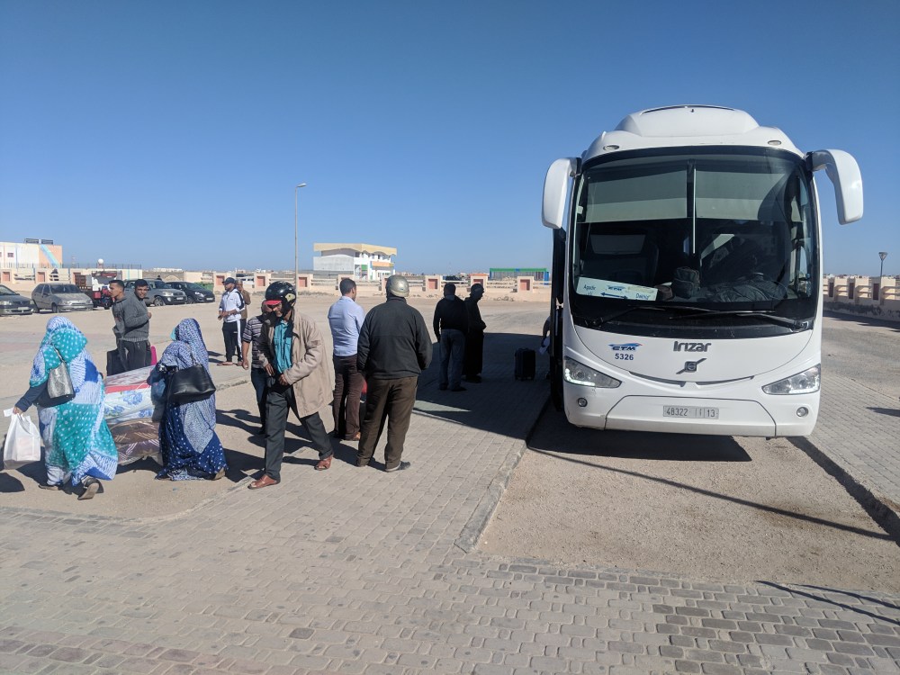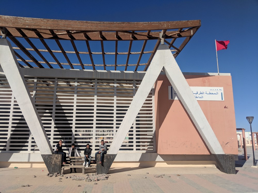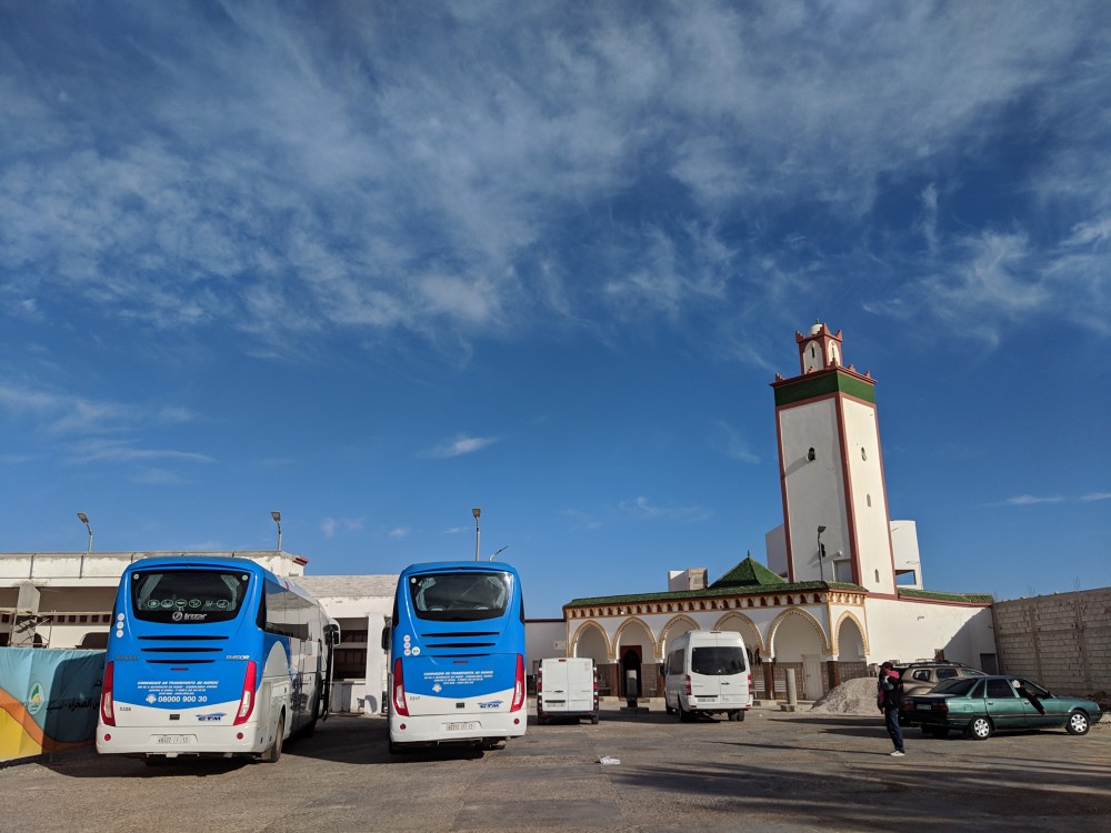 My Rough Guide to Morocco mentions 4 places to see in Western Sahara: Tarfaya, Laayoune, Smara and Dakhla. There isn’t much to see in either of towns yet the splendid desolation is tempting. I was thinking to go to each town but the transport options are poor: Laayoune to Tarfaya looks like there are only grand taxis, so they only go if they have a full set of people. There is one evening bus from Laayoune to Smara but I wanted to do it on a day trip, otherwise getting from Smara to Dakhla might take 2 days.In the end I decided to just go to Dakhla. Dakhla would be unavoidable anyway, it’s a stop on the long 1300km road to Mauritanian border.Sun rises after 8am in February in Morocco. That also means sun sets well after 7pm, which is good. But here cities come to life after dark and people go to bed late. Which means people don’t rise until after sunrise. Cafes open 9-10am most of the time.And in Laayoune buses to Dakhla leave around 8am. Most of them are buses coming from Agadir, Marrakech or even as far as Rabat. And to get to the bus station at 7am was a challenge. The city seemed dead, the taxis were few and far between. Even the sunrise muezzin call was at 7am, where normally you can wake up to his chant at 4am!