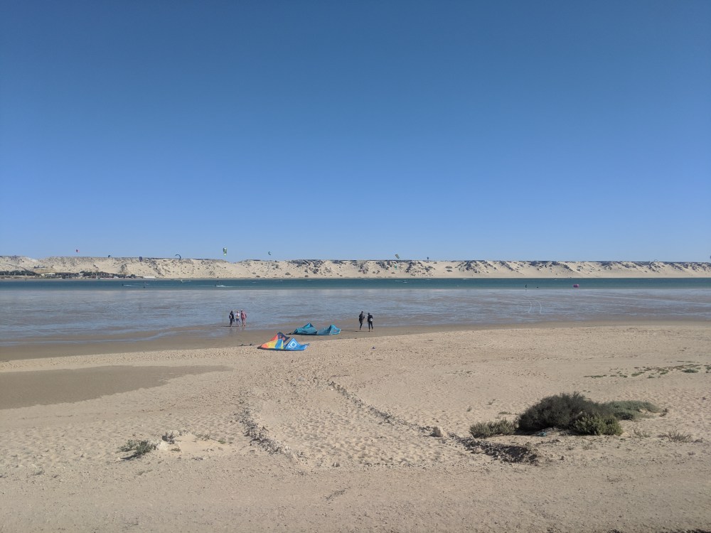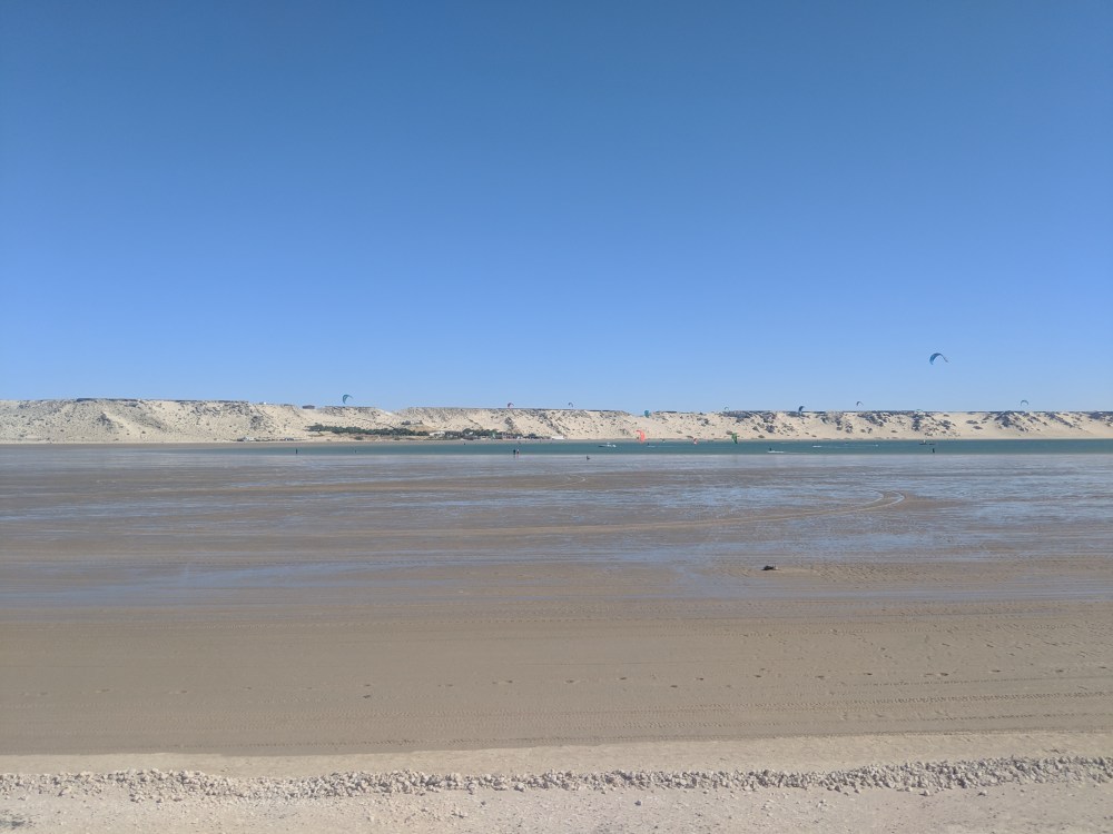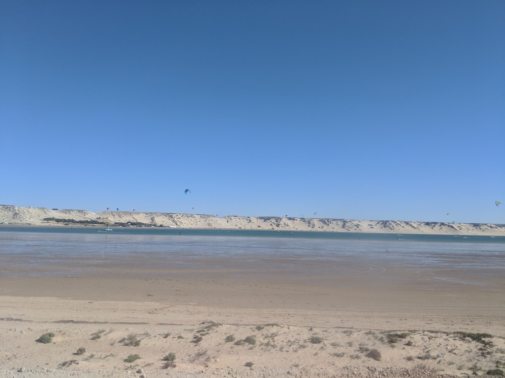 akhla is apparently popular with surfers and kitesurfers. Just when the bus turns right onto the Dakhla Peninsula, a sea of kites opens. Literally a hundred or more on a small piece of water is floating in the air.