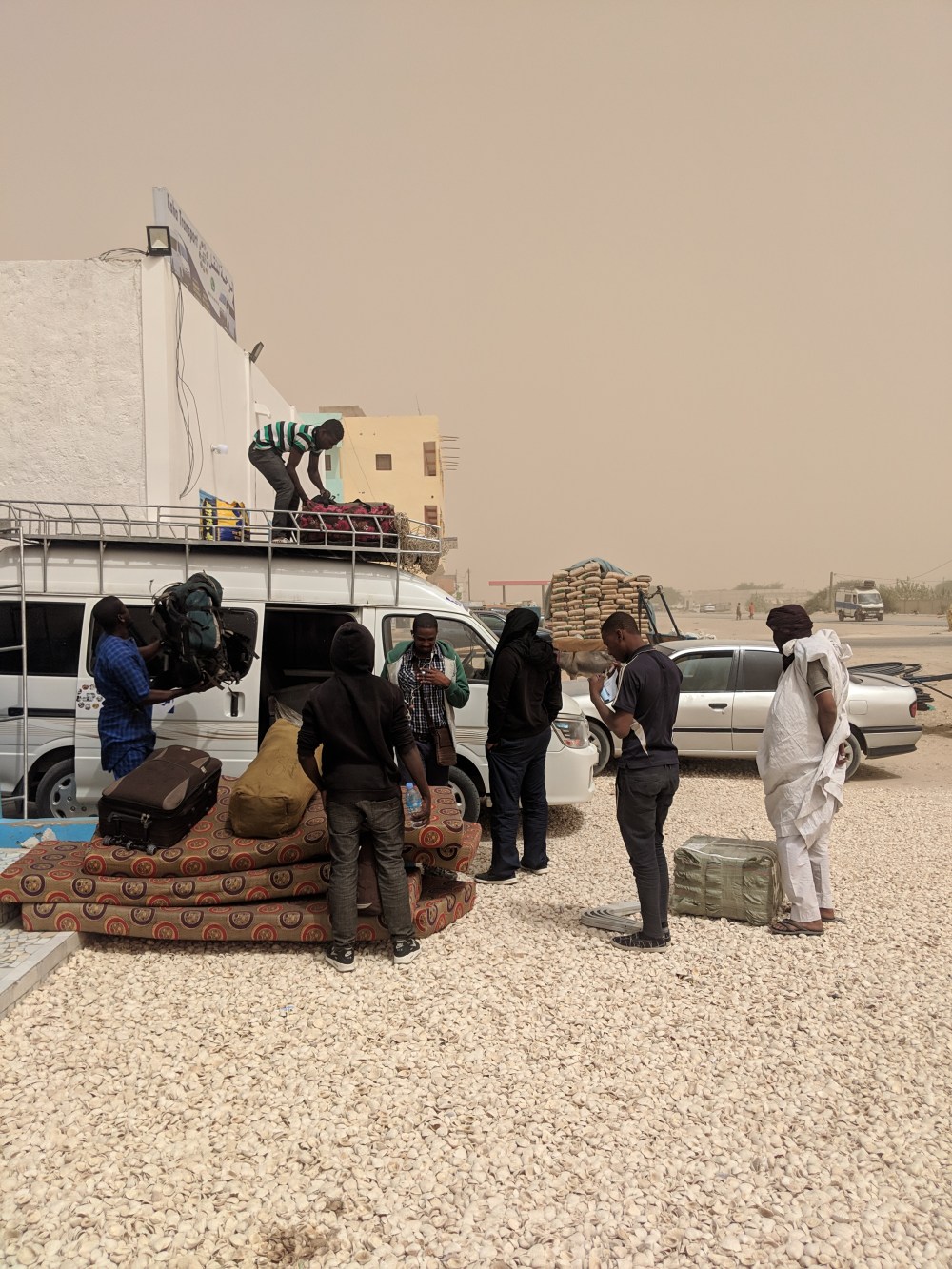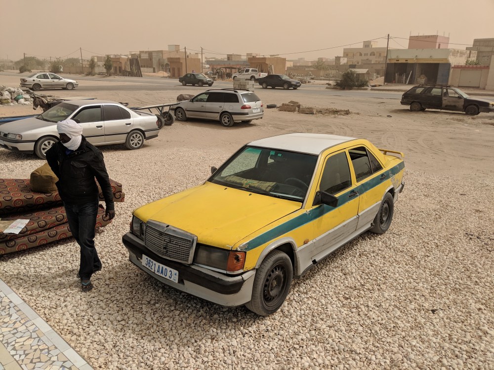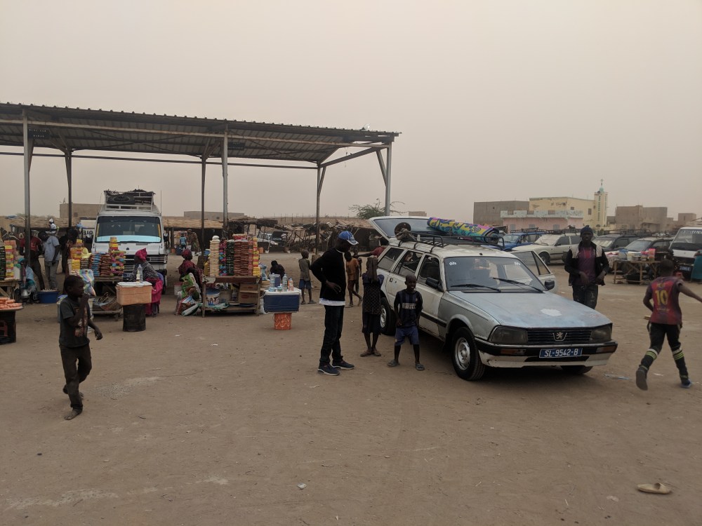 There was a strong wind in Nouakchott – one of the reason my cousin is stuck in a hotel waiting for this ship to come to the port. Sand was in the air. The sky had a colour of milk and coffee. The garage Rosso is South of town, about 10kms away. I paid 100UMR for the ride. The taxi driver called up the bus agency for me and they had a bus going to Rosso.