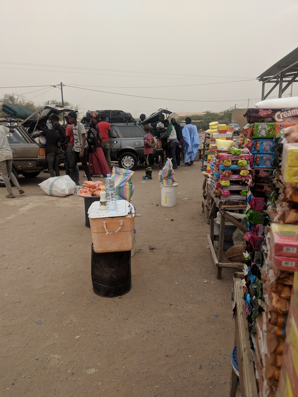 The garage where you can catch taxi brousse onwards is a bit over a kilometre away from the village. Of course we already had a friend with a motorbike who would take us there, 500CFA per person, one by one. I was the last as I wanted to do my business with the first shop that you see entering Senegal: Orange mobile shop.