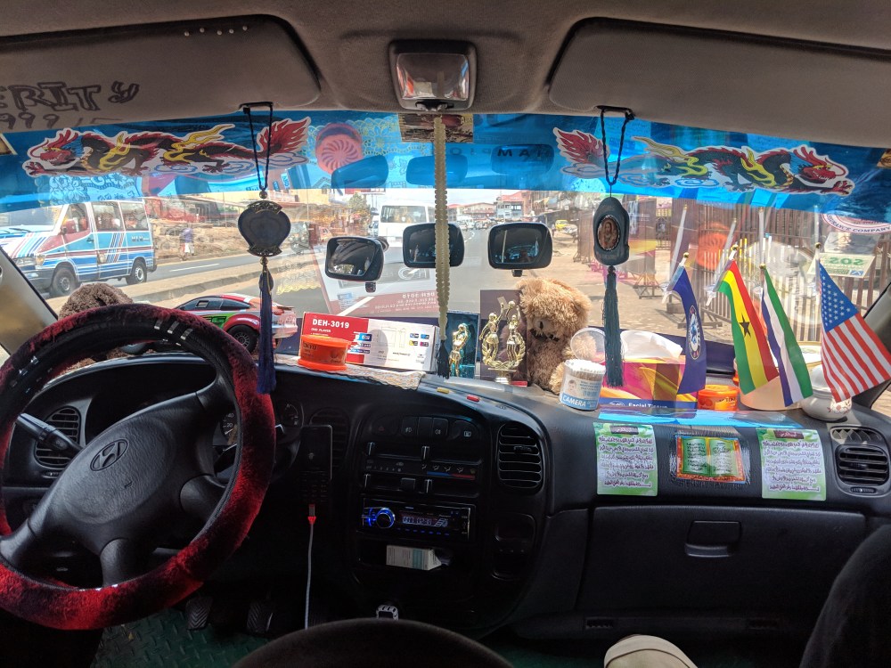 The road was uneventful, except the fact that there is payment for using the roads in Sierra Leone. There is some sort of of dual-carriage motorway close to the capital city. The driver had half of his house decorating the dashboard. I saw a racing car, three teddy bears, flags of Sierra Leone, Ghana, USA and Chelsea FC, a box of paper tissues, a plaatic box of cotton ear wipes, two boxes of orange lozenge and two golden statues of women playing volleyball, tastefully enhanced by mirrors places behind the statues and three rear mirrors dangling on rubber holds glued to the window. All of that was somehow attached to the dashboard and it didn’t budge when we were jumping off the speed reductors.