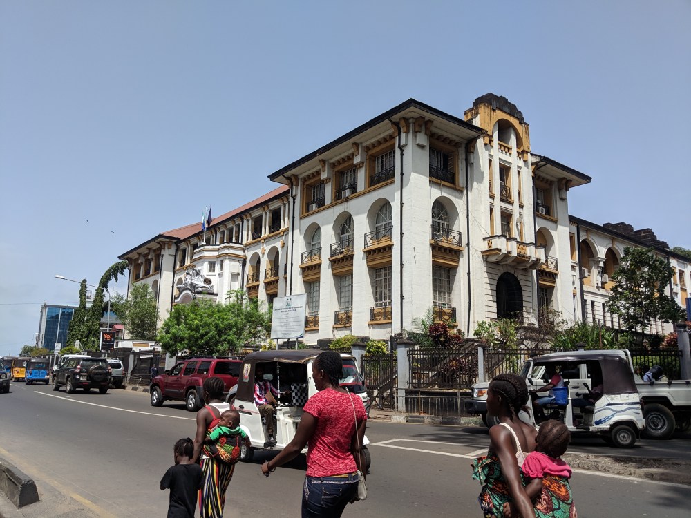 So, cooling down, I took a shared taxi to downtown – noone here understands the word “downtown”, they all say “town” for centre – 3,000le, we arrived and I went to a tourist market, in which I’ve been many years ago. It’s still there, I’m the only white person and possibly one of three tourists inside and the market is not small. It’s in a big spacious building. What welcomes me are posters saying “no free snapping allow” – no photos allowed, one must ask for permission. I thought of the gentlemen who stayed in my guesthouse and how they wanna encourage tourists to come over. Perhaps by not banning pics in one and possibly only tourist area that exists in town. Most of the market are baskets and materials, there are a few nice masks, too. I leave, take pictures of a cathedral and two weird monuments to some men. I walk on and go to Crown Bakery because if there is nothing to do, one can always drink coffee. I order Turkish coffee (15k). Next to me there is a woman who has an extremely British accent (at least in my ears) and a local man and they are lively discussing something, verging on a verbal argument. I don’t listen much but the woman speaks loudly and is visibly agitated. It’s about a school that she with her mom’s money wanted to build in Sierra Leone and she feels cheated for some reason, she’s been here since 2017 with her child and she’s coming back to her London house on Friday and will only come back for holidays, there is something wrong with the school, it was supposed to be primary but the government made it secondary plus they built a guesthouse which she didn’t want to. Oh well, Africa, beloved place but also the bottomless well of frustration and disappointment if you scratch below the surface. I feel for her, I feel for myself. I also find an address for what Bradt Guide calls Honorary Consulate of Ivory Coast in Freetown and think that maybe, possibly, if I really have to stay here over weekend I could just get the Ivorian visa here as well? I’ll call them up tomorrow morning.