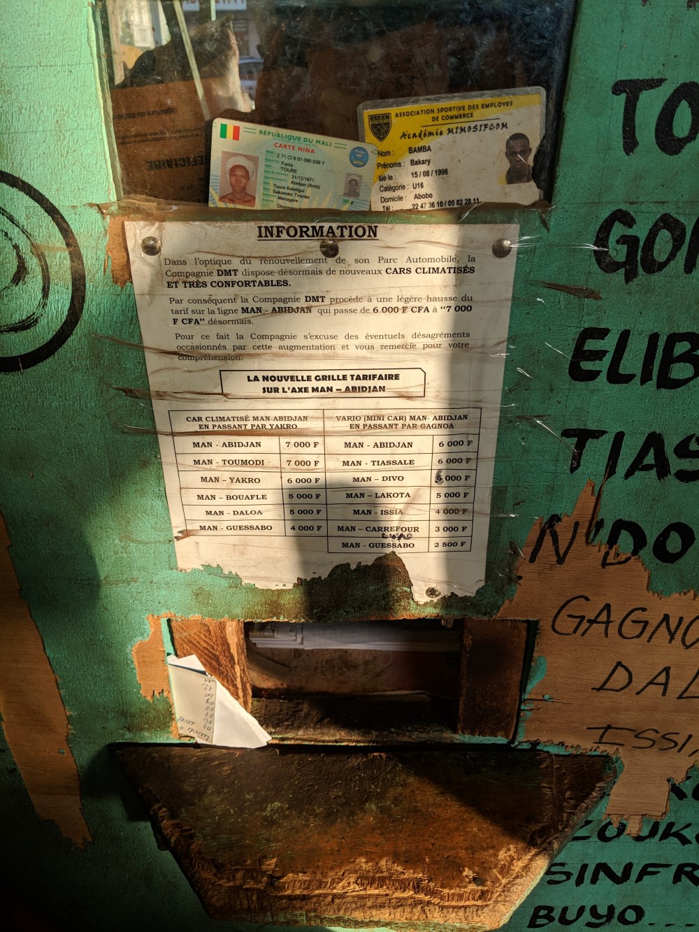 Why I even wanted to go to Korhogo. Not sure. There is the name which is unusual. I had a student in Abidjan, named Ferhana (another unusual name) who was somehow different from all the others female students, apart from also being beautiful – I guess you’d call it je ne sais quoi – and somehow I remembered she was from Korhogo. I’m not chasing a student – she’s in Abidjan anyway for all I know – just it triggered my memory. Also there was lately some military stand off in the country and it started in Korhogo. Also, it’s in the North, soon desert starts, borders with Burkina and Mali are not far, and these are colourful places. Also, Bradt Guide mentions it in highlights, artisans and féticheurs galore. And Bradt Guide for Ivory Coast is quite thin, barely over 200 pages, for such a big country it isn’t much.When I got off the minibus from Danane in Man I asked the driver for the place where busses to Korhogo leave from. He directed me to a place he called gare de Korhogo and it happened to be next door from my hotel in Man, hotel de la Paix. The day before the travel I went there – the price of the ticket being the strange 10100cfa (it’s the 100cfa that’s strange, people won’t sell you things here if you don’t have change, such is the shortage of coins). I wanted to buy ticket in advance. But I did ask to get a seat not by window but by the aisle. Little I knew there is another seat on that bus – in the middle – and I used the word au milieu which means in the middle but which was used before for me when I wanted aisle seat. I have my scratched knee and I want to be able to stretch my legs. The man selling tickets said he’d have to call the boss but then he said I should come back the next day and buy the ticket before departure and I should be there at 6:30am coz that’s when they start loading up the baggage into the bus and there won’t be a problem with tickets. And I did ask twice about 6:30am because the piece of paper on the wall says “every Monday at 6am” and he did 6:30am is fine and it’s better to buy ticket before departure.Same day, a day before departure, while enjoying espresso and croissant aux amandes in the bakery in town, about 10min walk from the hotel, across the street I saw another agence – here it seems every company has its own depot – with a big sign saying “Man – Korhogo direct”. Of course I go there and ask. The two men sitting there tell me the ticket is 12000 and there is a big bus (I make a point of asking about it, they say it has 45 seats) and I can buy it before departure and the journey is “if there are no problems, 12 hours long”. Departure is at 7am.Later on I see a big bus pulling over at that agency and it looks new and shiny and nice. Ah finally. I might even be able to read a book on board.Also later on the same day the driver from Danane – the one who told me about gare de Korhogo – sees me on the street and asks me about I found the bus. I tell him there are actually two places that have bus going to Korhogo and he says he doesn’t know the one that’s actually near where he stops, only the depot next to my hotel.I get up at 5am, there is running water so I wash myself. At 6:05am I am at the gare. The bus is there. More of a wreck of a bus. It didn’t look particularly horrible but it didn’t look good. I see there are three narrow seats in a row, 3+2. I think. There is still time. The other agency had a nice bus. It’s more expensive but it will be more comfortable. I walk down the road there.10mins later the man around the other agency call people “Abidjan, Abidjan”. Abidjan is South at the coast, Korhogo is far North. I ignore them telling them “me, I go to Korhogo”. There is a big bus looking shiny and inviting and I can hear it calling me. Behind the bus stands a minibus.The ticket counter in the agency is a window of literally 20cm by 20cm and no window, placed at the height of my hips. I have to almost crouch to be able to communicate with he person inside, all that on French which I barely understand. The man inside tells me he can sell me a ticket to Korhogo but I’ll change a bus in a town called Bouaké. Wait, I thought it was direct.