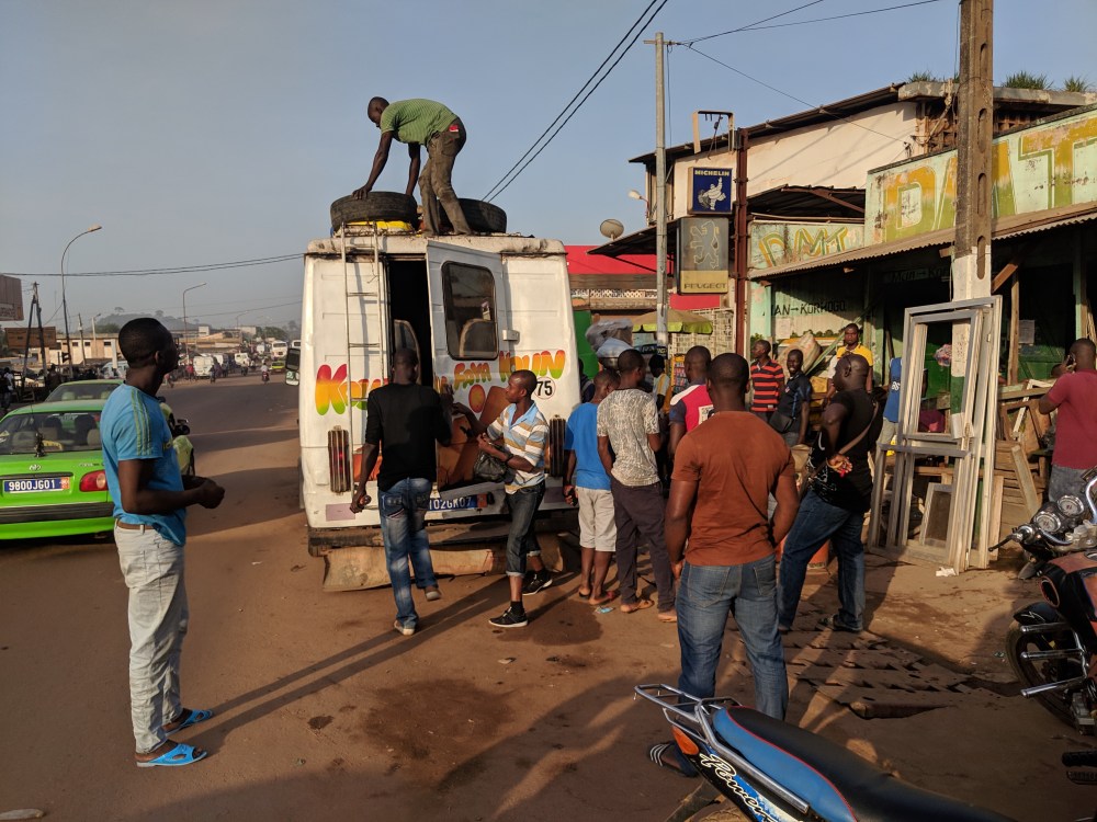 I consult Google Maps. Bouaké is almost straight to the East from Man, 6:30hrs/330kms away. From there it’s 3:40hrs/225km to Korhogo. Google Maps also shows direct route to Korhogo, 7hrs/500kms away. I think a bit and decide to go back to the gare for the direct bus that doesn’t look good.I reach the gare at 6:25am. There is a crowd and they are already loading bags in. I find the man who sells tickets, he tells me to sit down while he’ll call the boss. And I sit. And I think it doesn’t look good. At transport sites people want money from you immediately you come in and here I’m supposed to wait? At about 6:40am I decide to ask straight if they have a seat for me. The man with tickets directs me to another man and the other man directs me to the other man who starts talking and talking. I interrupt him and ask again – do you have tickets or no? No we don’t.