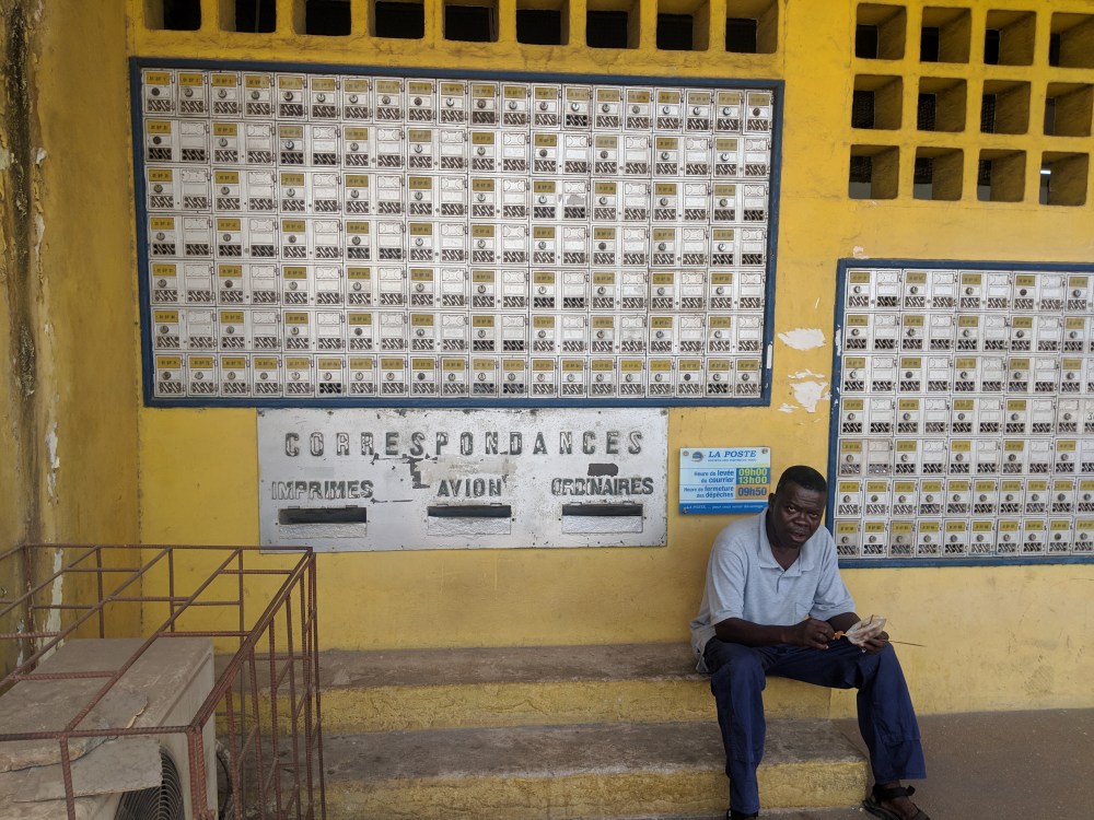 I went to the post office, La Grande Poste, 300cfa for a zemidjan. Outside the post office a man was selling postcards, all of them burnt out by the sun and thus expensive at 500cfa. I bought some artsy ones nevertheless and posted them. Stamps are 600cfa to Europe. There was a sticker showing time of delivery of mail to some countries. Gabon strangely has the shortest time, 2 days for regular post and 3 (!) days for EMS, that’s courier. France at 6 days of regular post delivery has longer time than Switzerland (5) but EMS takes only 2 days.