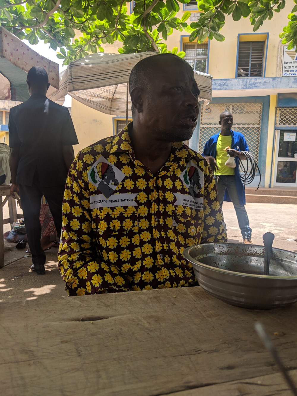 Right in front of the post office there were women making sandwiches and fresh juice. The sandwich was with avocado – finally someone came up with this idea – and other onions. It was good but I’d add more vinaigrette. 300cfa. The juice was lemon and orange and it was delicious, but it was diluted with water and heavy sugar was added. 200cfa. I ate sandwich opposite a man wearing what seemed like a feminist/equal rights shirt. I said to him I liked it twice, he ignored me. Or maybe he didn’t hear me. The words on the left are “Togolese woman, a fighting woman”.