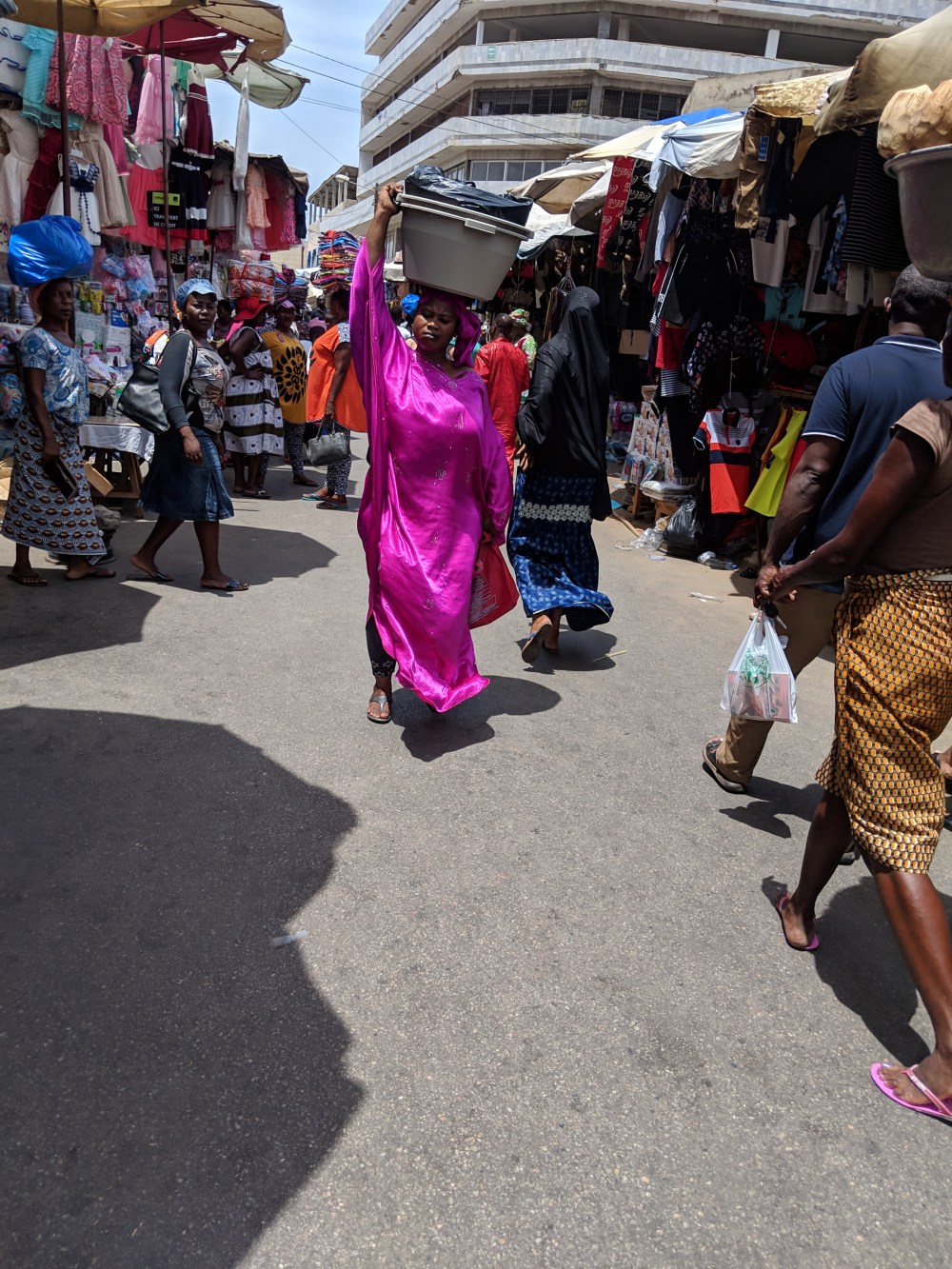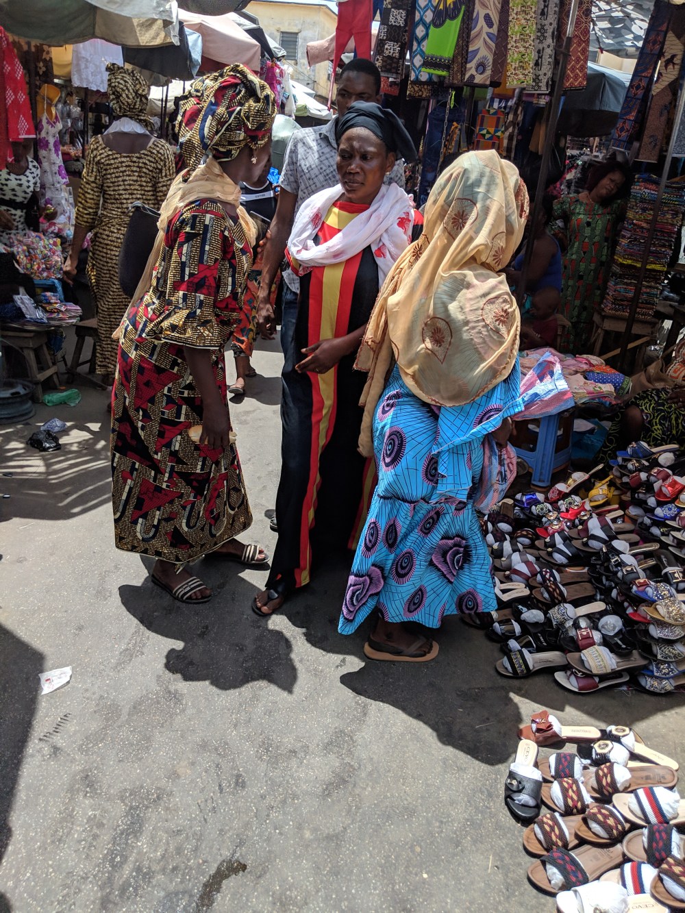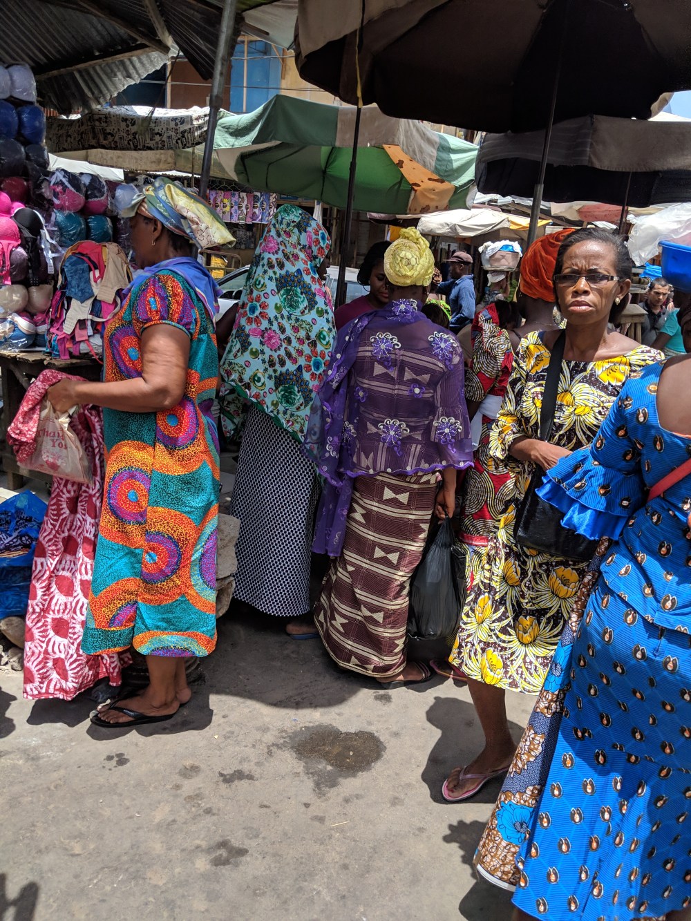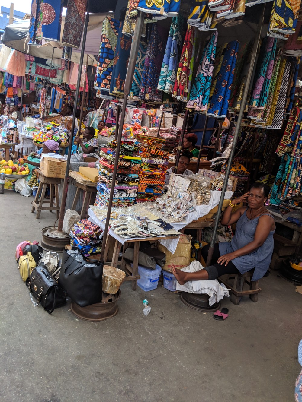 So I hoped I will take some pics of the shops run by women known as Mama Benz, from the cars they are driven in. But the materials are hidden from the sun, in the shadow, so all in all, even though the market is grand and interesting, it’s not that easy to snap the colours of Lomé materials. Moreover, someone had a telephone fétiche around me and some of the nicest pics, including a Muslim woman splendidly dressed in orange, came out unfocused.