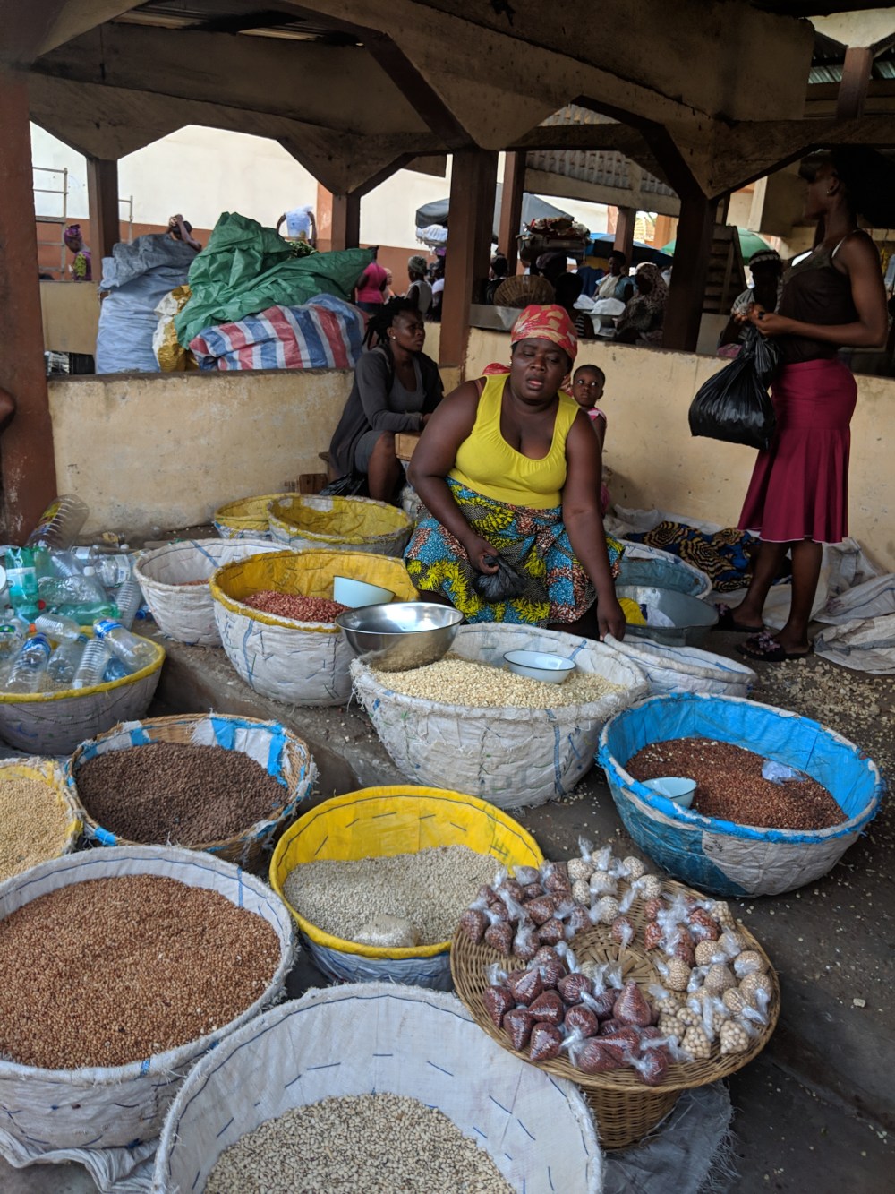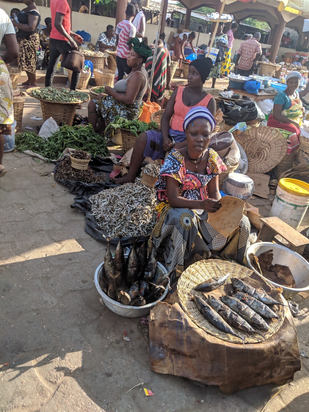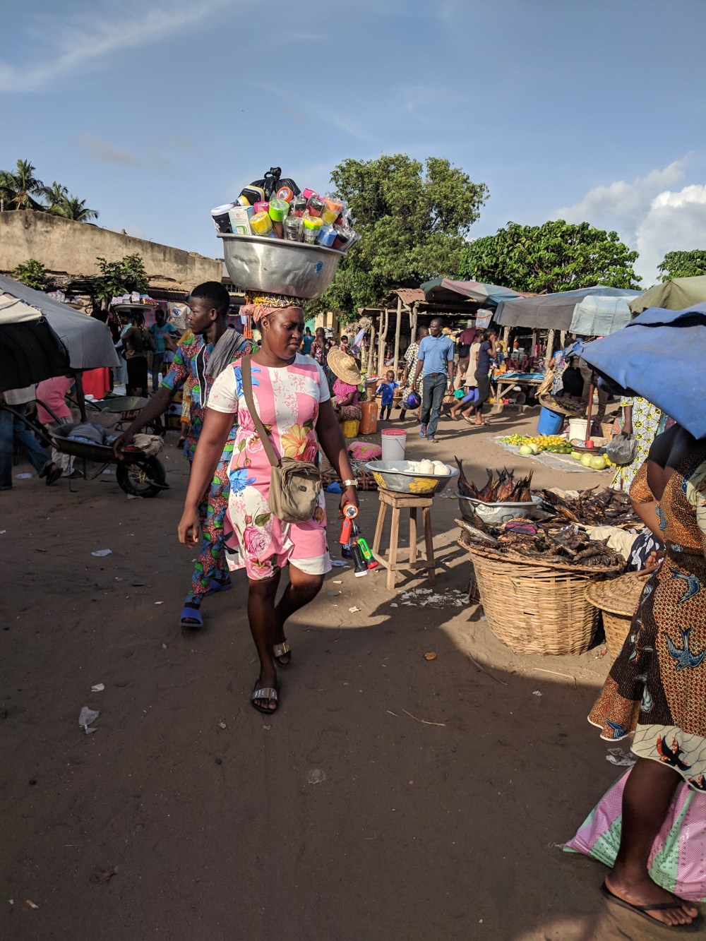 I looked around and on one other piece of the pottery I saw it was “3000-3800 years old”. And there was a particularly beautiful piece of the pottery, a complete head, only “2000-2400 years old”. Not wanting to bother the shopkeeper any further – I couldn’t buy anything here even if I wanted – I told him I have 2 price questions. He consulted the pricebook for the 3000-years-old piece: 18million. I’ll let you do the currency conversion yourselves. And then I asked for the head’s price and he without looking into his pricebook said the price. I asked how he knew the price of this one without the book, he answered that he knew I’d ask the price of the head so he looked it up beforehand. 20million CFA. €30,000. 130,000zł. Now that in a shop at the edge of a market where sachets of water are sold for 25cfa each, or sacks of potatoes are sold for 100cfa. Mangoes! Dry fish! Onions! Second-hand clothes! Waxed materials! Nok pottery!