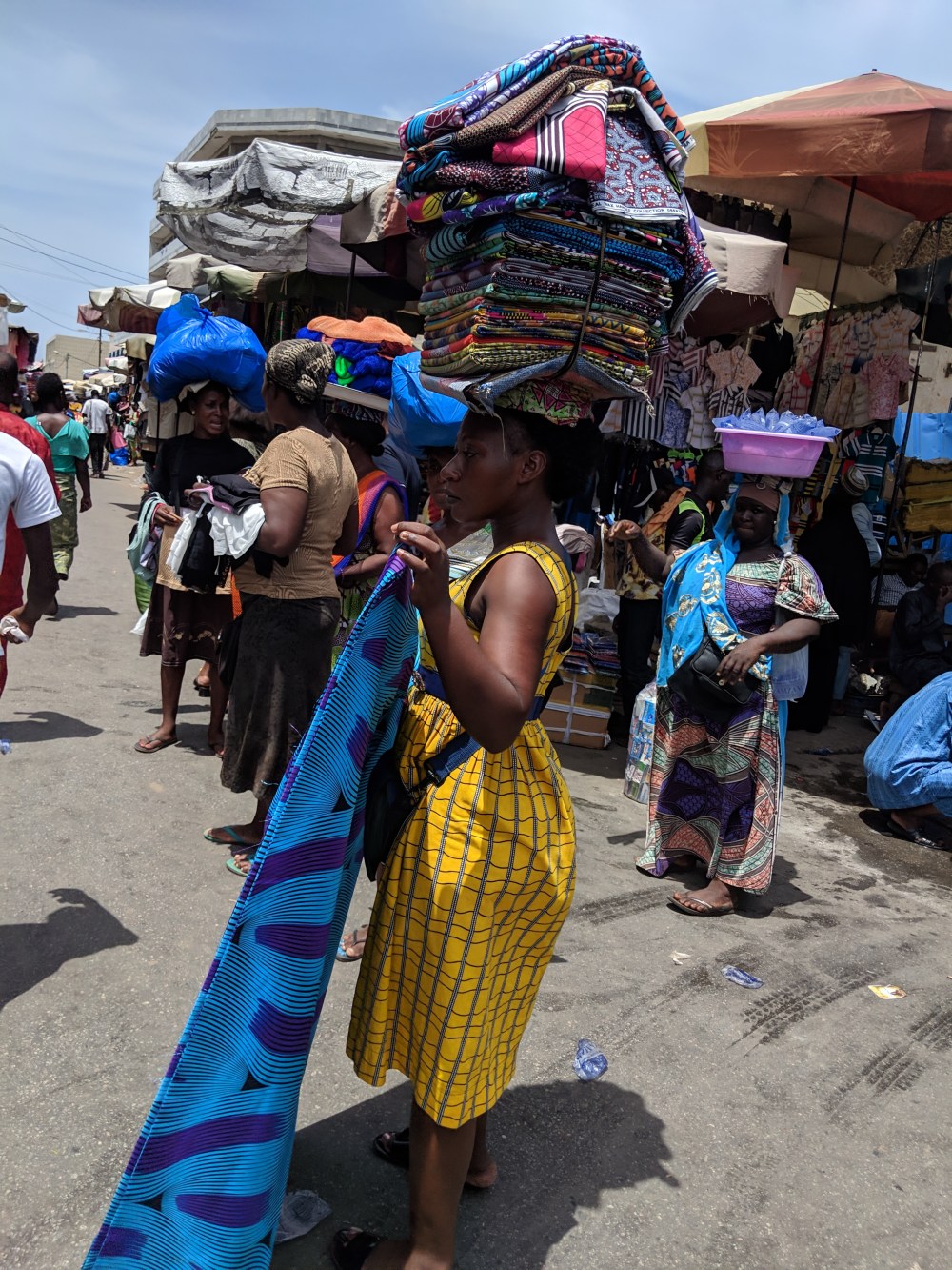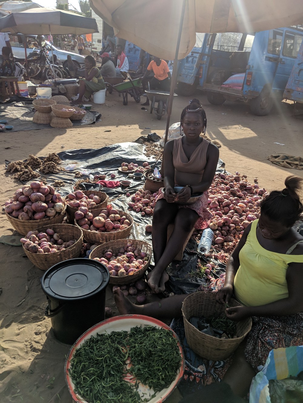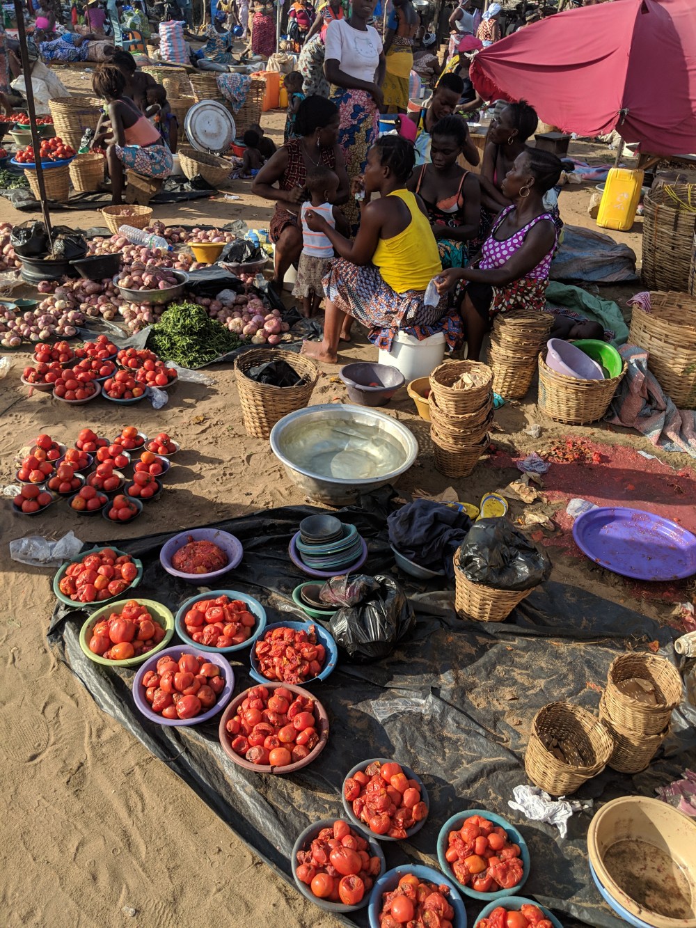 I looked around and on one other piece of the pottery I saw it was “3000-3800 years old”. And there was a particularly beautiful piece of the pottery, a complete head, only “2000-2400 years old”. Not wanting to bother the shopkeeper any further – I couldn’t buy anything here even if I wanted – I told him I have 2 price questions. He consulted the pricebook for the 3000-years-old piece: 18million. I’ll let you do the currency conversion yourselves. And then I asked for the head’s price and he without looking into his pricebook said the price. I asked how he knew the price of this one without the book, he answered that he knew I’d ask the price of the head so he looked it up beforehand. 20million CFA. €30,000. 130,000zł. Now that in a shop at the edge of a market where sachets of water are sold for 25cfa each, or sacks of potatoes are sold for 100cfa. Mangoes! Dry fish! Onions! Second-hand clothes! Waxed materials! Nok pottery!