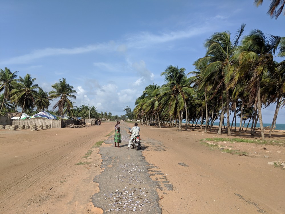 Aného is a few kilometres from Benin border, 45kms from Lomé. I walked on an empty gorgeously looking beach. Water was blue, palms grew by the sand, the fishermen were sleeping in their shadow. People were curious about me, stopping me for questions. A woman was drying tiny fish on the remains of the asphalt on the road running along the beach. A white man passed me on a mountain bike. In this heat. There was nothing colonial.