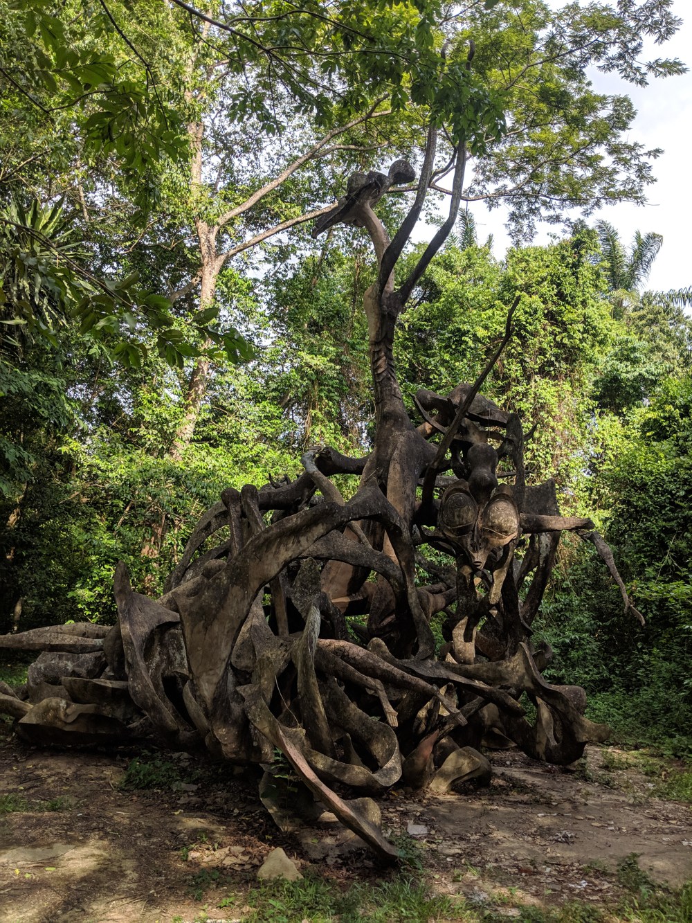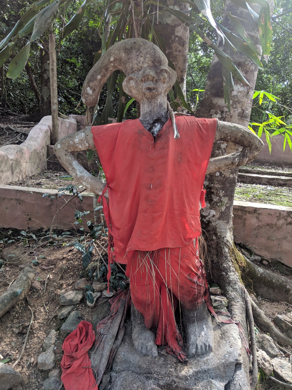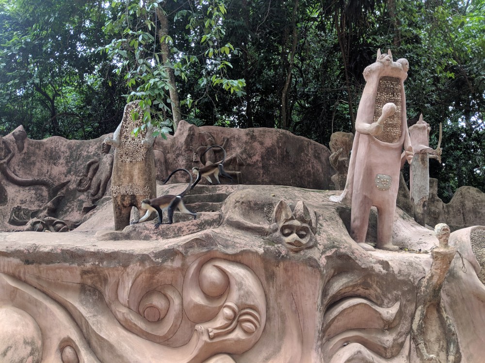 The forest begins, the road becomes quiet, there are many monkeys around and the road is adorned with weird sculptures.