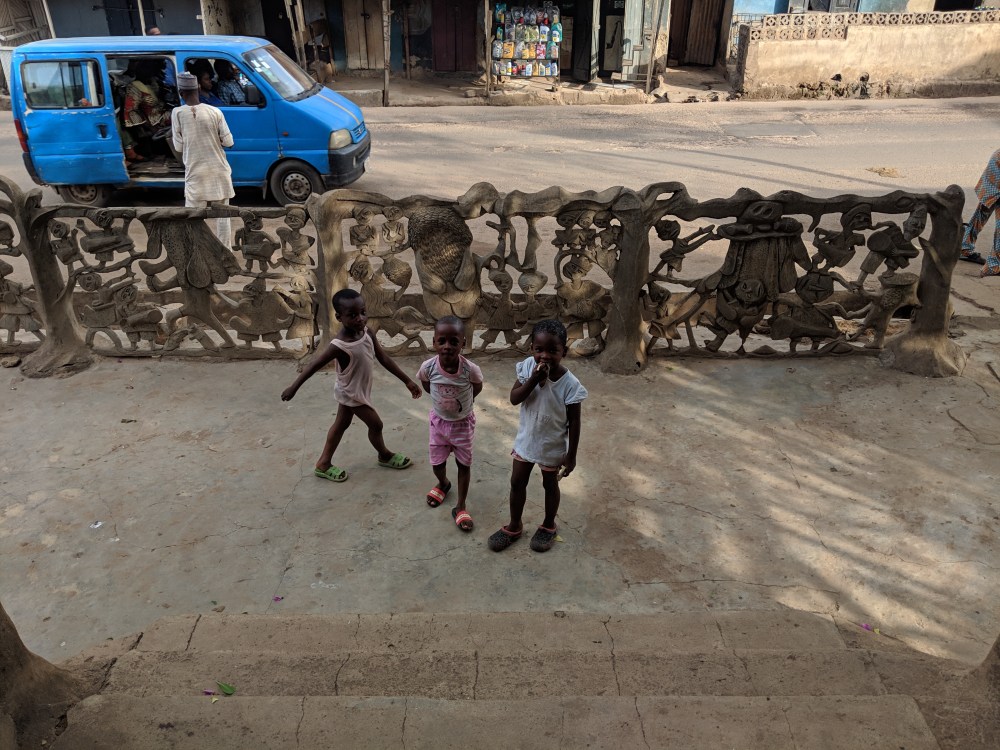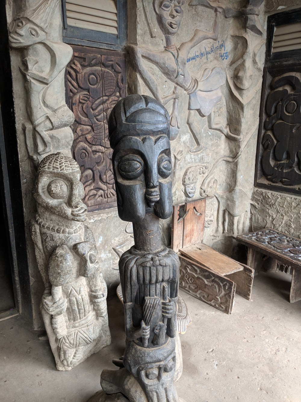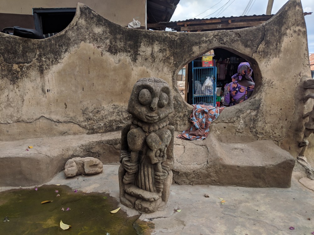 I go on, there is a statue of some monster, by it sits a man, who only speaks Yoruba but the gesture says “give me something”.