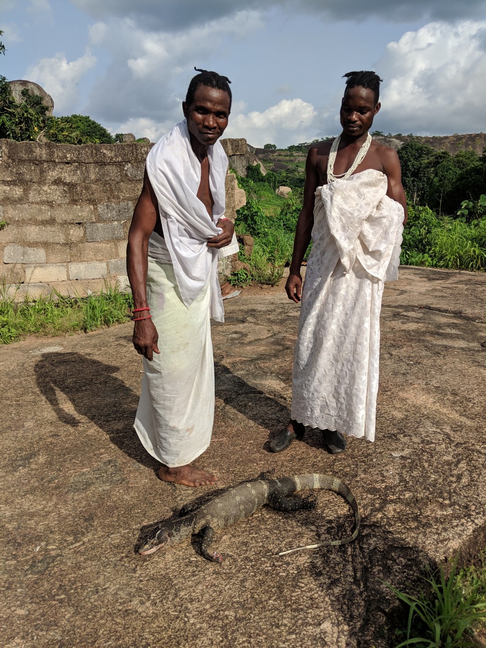 So we met the priest. In fact there were two and Paul also called then chiefs. Chiefs also have their titles, these two were chief Lorin and chief Odofi. They stayed in a hut in which no clothes are allowed and they even invited me in. One of them said a 5 second prayer, I gave him N200 when the other priest started asking for his own. Well, I was not ready for two priests and I also thought they could share. I also did not technically gave them the money, I had to put the bill on the rock they were standing on and they would pick it up from there. They also brought out a dead alligator which was going to be their meal.