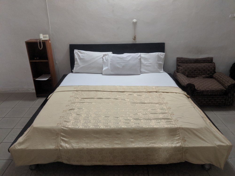 The driver didn’t know where the hotel was so I led him using Google Maps. We went into some small streets, the car’s lights did not want to switch on, for 100 meters we drove against the traffic. I even wondered if it’s safe to just get into an unmarked car, at night, in this rain, but we got to the hotel, the driver still barefoot. I asked him to wait in case the cheapest rooms were our or the hotel was full. But they had rooms and, as described on iOverlander, the price was N8000 but I said I’d stay two nights, the price went down to N7000 if paid in cash. Sure. It was a single room silver. This is what a bed in single room in Nigeria looks like.